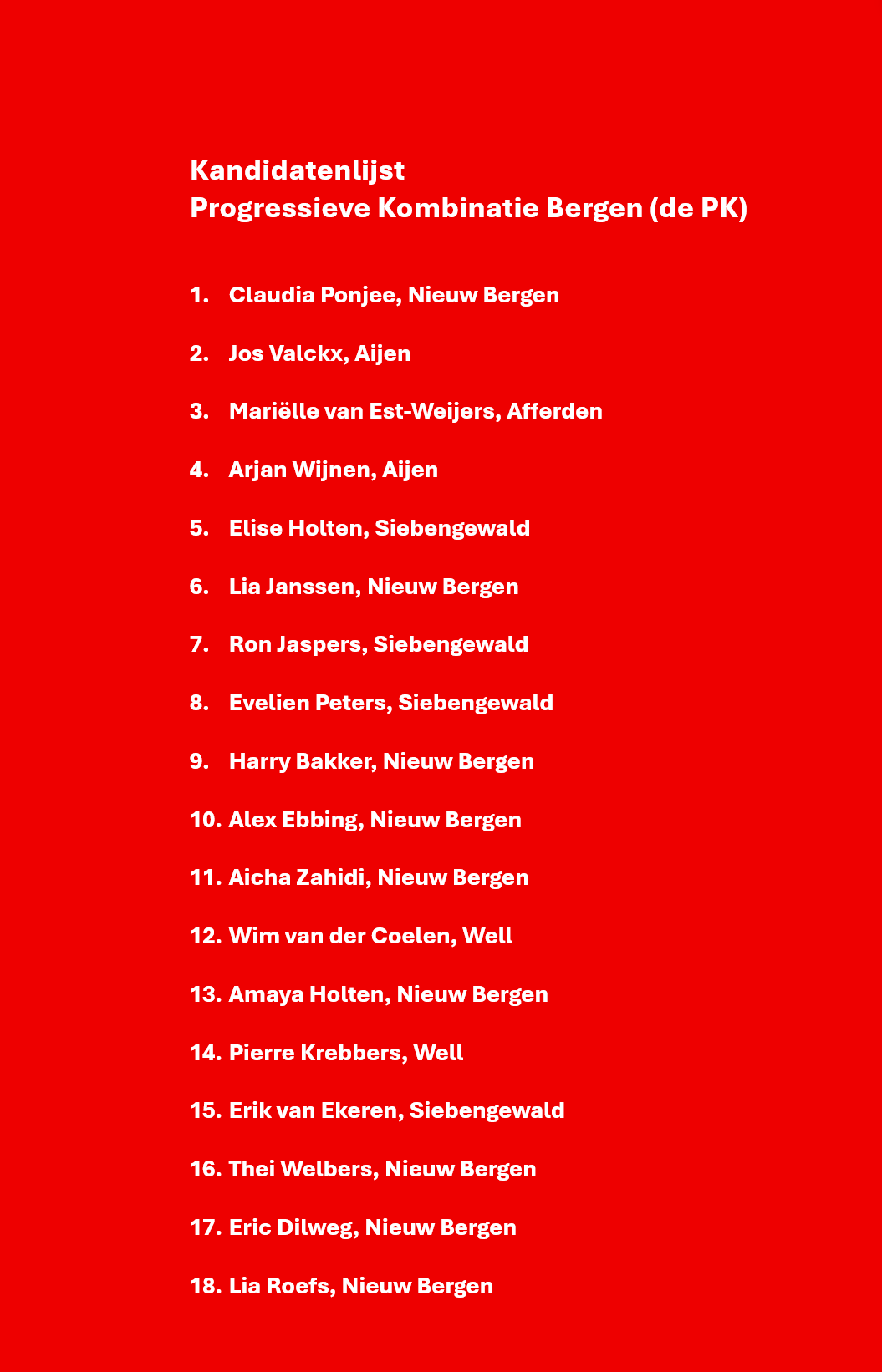 De gemeente Bergen is meer dan een plek om te wonen. Het is een gemeenschap van dorpen waar mensen elkaar kennen, naar elkaar omzien en samen het dagelijks leven vormgeven. Als PK zijn wij diep geworteld in onze gemeente: wij wonen hier, werken hier en zijn onderdeel van dezelfde samenleving als onze inwoners. Juist daarom weten wij wat er leeft, waar kansen liggen en waar zorgen vragen om aandacht. Wij voelen ons hier thuis.