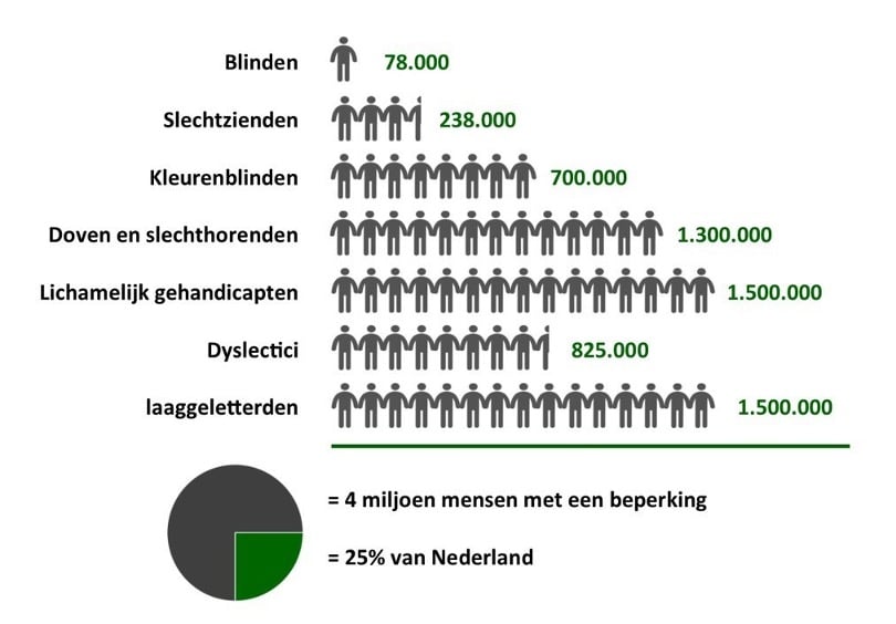 Een kwart van de Nederlandse bevolking heeft één of meerdere fysieke of mentale beperkingen die het gebruik van het internet bemoeilijken. Denk daarbij aan mensen die doof of slechthorend zijn, blind of slechtziend, kleurenblind of dyslectisch, of één of meerdere ledematen niet kunnen gebruiken. Ook zijn er meer dan een miljoen laaggeletterden en een miljoen minder begaafden. Daarnaast hebben we te maken met een groter wordende groep ouderen. Voor al deze mensen is het belangrijk dat websites en apps zo toegankelijk mogelijk zijn. De overheid mag niemand buitensluiten, daarom geldt er een wettelijke verplicht voor toegankelijkheid van overheidswebsites en -apps.